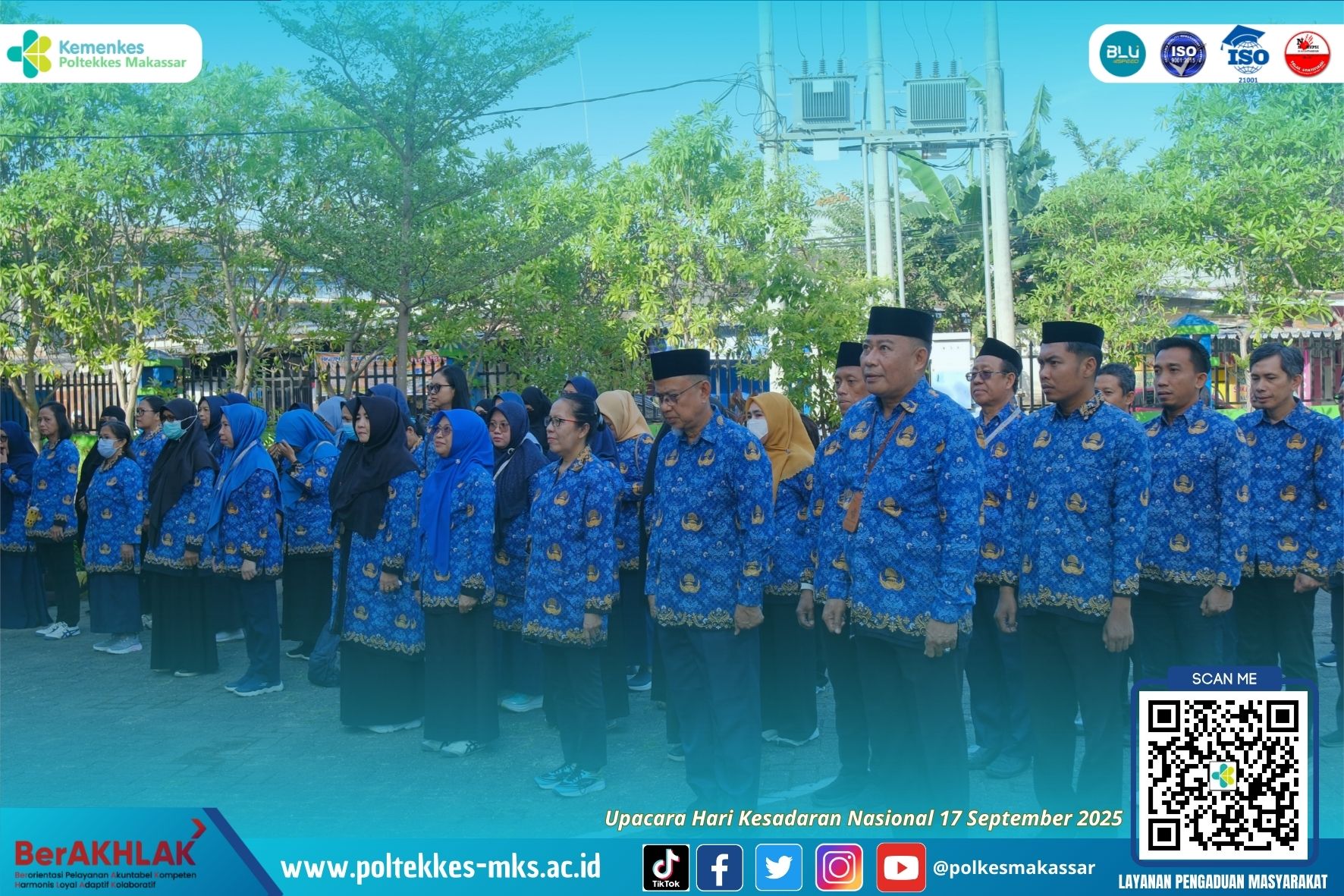 Makassar, 17 September 2025 | Dalam rangka memperingati Hari Kesadaran Nasional, Poltekkes Kemenkes Makassar menggelar upacara bendera yang dilaksanakan pada hari ini, 17 September 2025, di halaman upacara Direktorat Poltekkes Kemenkes Makassar. Upacara ini dihadiri oleh seluruh pegawai Poltekkes Kemenkes Makassar, baik dari kalangan dosen, staf administrasi, maupun tenaga pendukung lainnya. Upacara dimulai pada pukul 07.30 WITA dan berlangsung dengan khidmat. Pembina upacara kali ini adalah Ibu Siti Nurul Fajriah S.Ft.Physio., M.Kes, Wakil Direktur I Poltekkes Kemenkes Makassar, yang menyampaikan sambutan dengan semangat untuk meningkatkan kesadaran dan komitmen dalam memberikan pelayanan kesehatan yang berkualitas kepada masyarakat. Dalam sambutannya, Ibu Siti Nurul Fajriah menekankan pentingnya peran setiap pegawai Poltekkes Kemenkes Makassar dalam meningkatkan kualitas pendidikan dan kesehatan di Indonesia. Beliau juga mengajak seluruh peserta untuk lebih sadar akan tanggung jawab sosial yang diemban, serta pentingnya menjaga integritas dan profesionalisme dalam setiap tugas yang diemban.