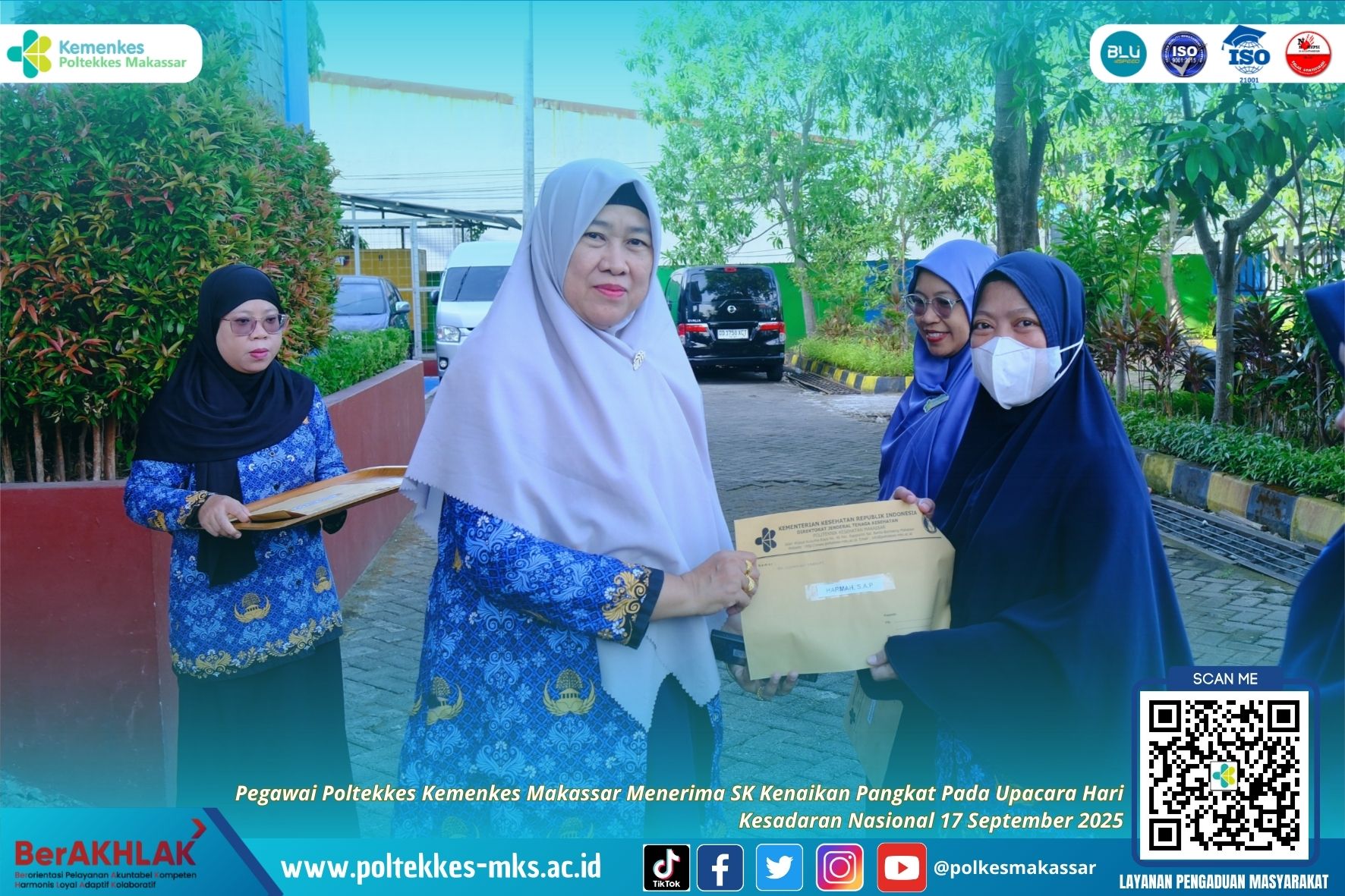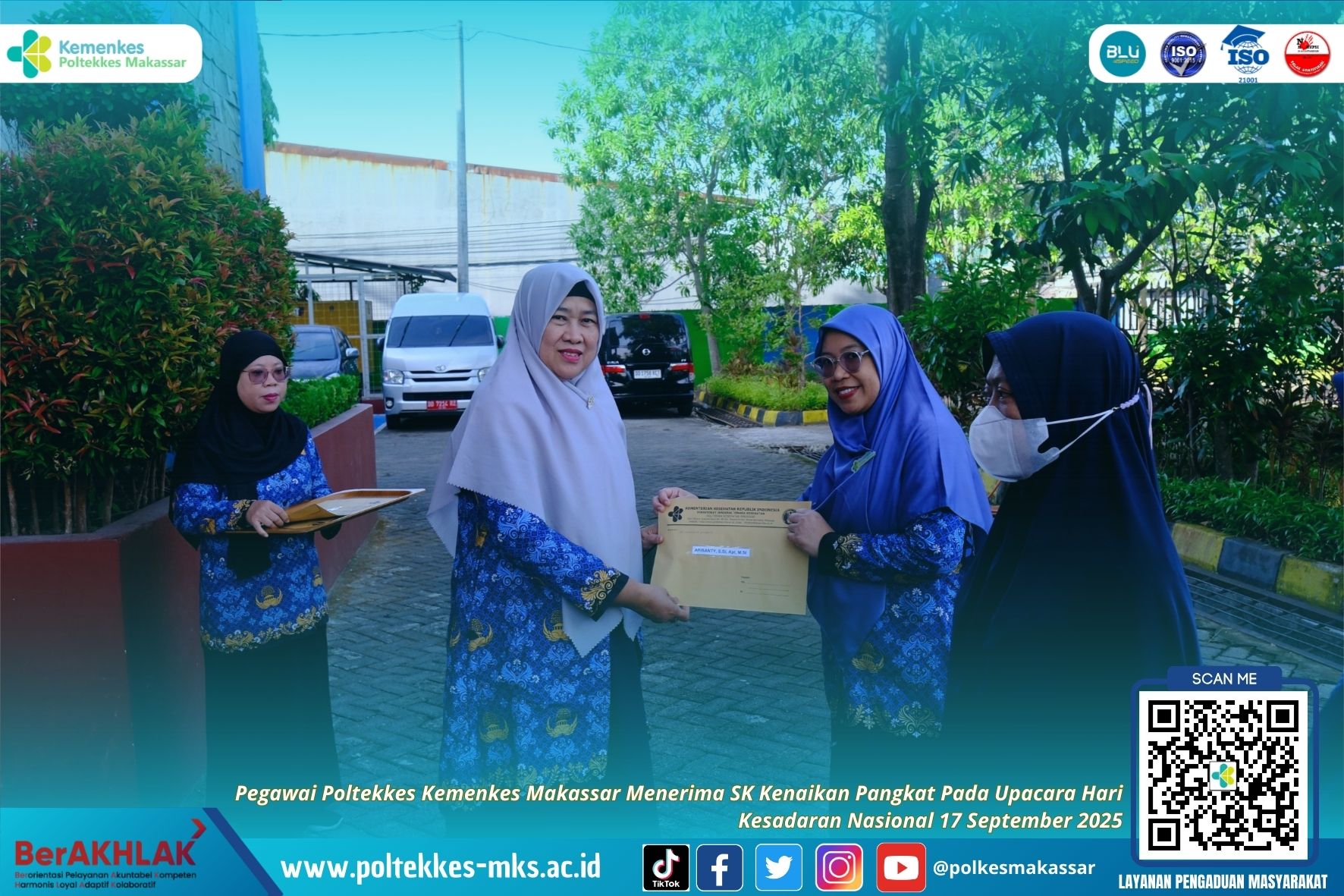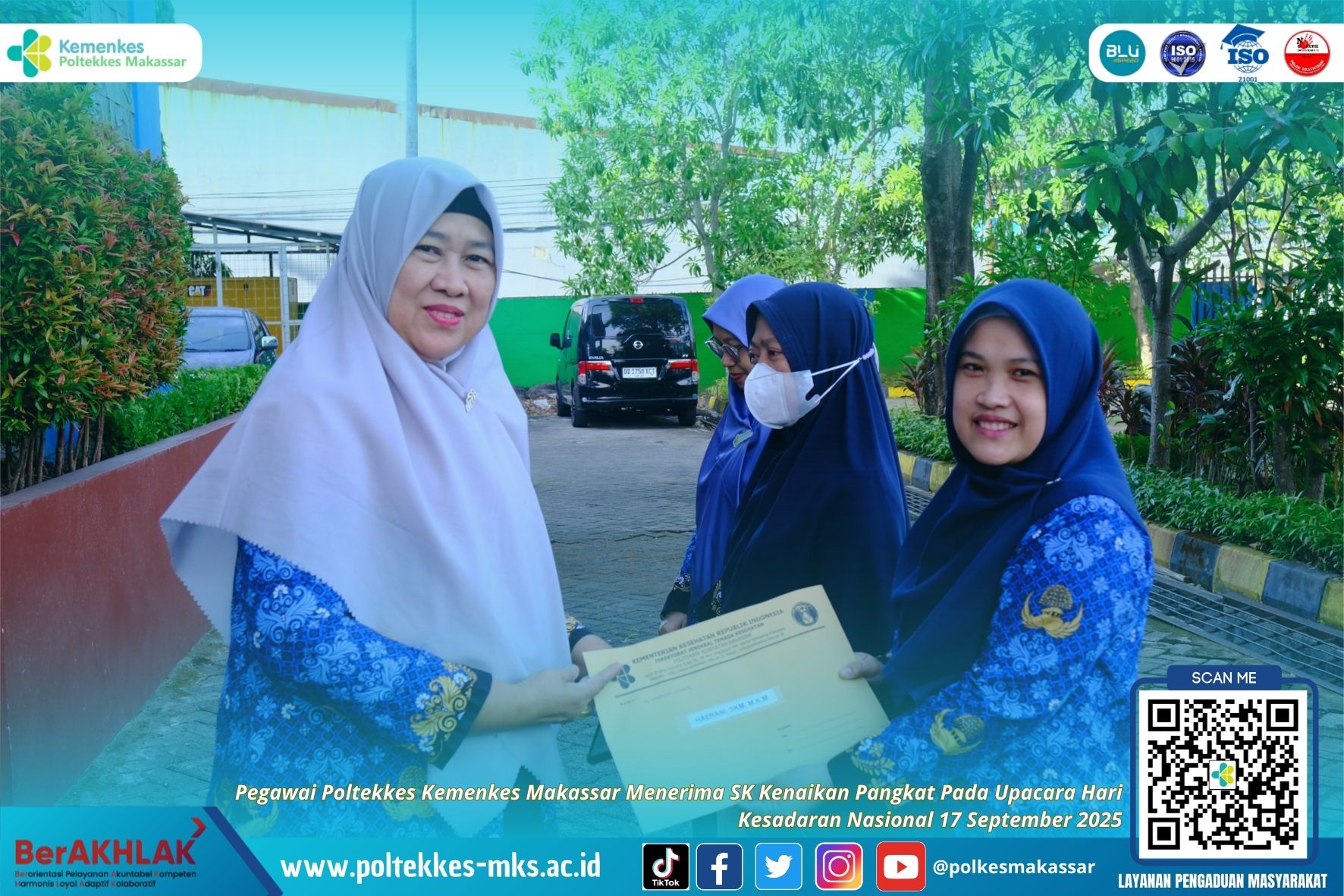 Selain upacara yang penuh makna, kegiatan tersebut juga diwarnai dengan momen istimewa berupa penyerahan Surat Keputusan (SK) Kenaikan Pangkat kepada tiga orang pegawai yang telah menunjukkan dedikasi dan kinerja yang luar biasa. Ketiga pegawai yang menerima SK tersebut adalah contoh nyata dari komitmen dan profesionalisme dalam melaksanakan tugas, serta kontribusi mereka yang signifikan terhadap pengembangan Poltekkes Kemenkes Makassar. Penyerahan SK Kenaikan Pangkat ini dilakukan dengan penuh penghargaan oleh Ibu Siti Nurul Fajriah, yang turut mengucapkan selamat kepada para penerima penghargaan. Beliau berharap, dengan kenaikan pangkat ini, para pegawai semakin termotivasi untuk memberikan yang terbaik dalam menjalankan tugas dan tanggung jawab mereka, serta terus mengembangkan diri dalam rangka mendukung visi dan misi Poltekkes Kemenkes Makassar.
